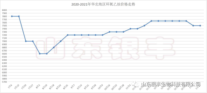 其次是環氧乙烷方面,國內環氧乙烷市場主流參考報價位于7450-7500元/噸。截止1月12日,國內環氧乙烷報價平穩,亞洲乙烯市場行情維穩,CFR東北亞報價1055-1065美元/噸,CFR東南亞報價990-1000美元/噸。裝置方面,12月31日,奧克化學20萬噸環氧乙烷裝置不可抗力停車,具體恢復時間待定。三江化工1月12日停一套6萬噸裝置,開車時間不詳。1月5日,占世界主要生產環氧乙烷8.25%的陶氏化學突然宣布不可抗力,預計不可抗力將持續到今年10月低。多套環氧乙烷裝置檢修,原料東北亞乙烯價格處于高位運行,對環氧乙烷成本支撐力度強勁,據統計,春節前仍有多套環氧乙烷裝置正值檢修狀態或者計劃檢修,環氧乙烷價格年前或將以維穩為主,但下游聚羧酸減水劑單體市場交投清淡,新單價格不斷走軟,需求面無利好支撐,隨著年后環保政策放寬,廠家檢修結束,價格維穩是關鍵。