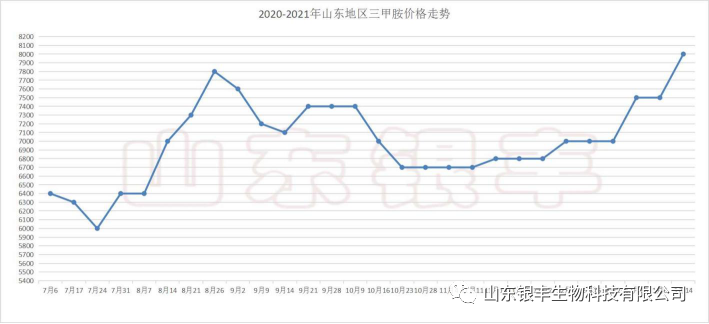 首先是三甲胺方面,上期文章中有提到,隨著春節將近,政府整治環保行動不斷嚴格,全國多地都相繼出臺關于化工以及煤炭等高污染行業的停電限產政令。加之近期最基礎的原料煤炭受河北,山西疫情嚴控,物流運輸受到限制,煤炭到貨量減少,致使化工企業生產受限。受此影響,對三甲胺供應面造成進一步壓縮,產量不斷減少,價格也相應水漲船高。近期三甲胺價格以50至100元每噸的價格連續多次跳漲,目前三甲胺主流出廠成交價格參考8500元/噸,較上期文章發表后已累計漲幅達900元/噸。就當下情況而言,在膽堿廠家需求正旺及三甲胺出貨依舊緊張的雙重壓力下,三甲胺價格繼續不斷上漲依舊是大概率事件。